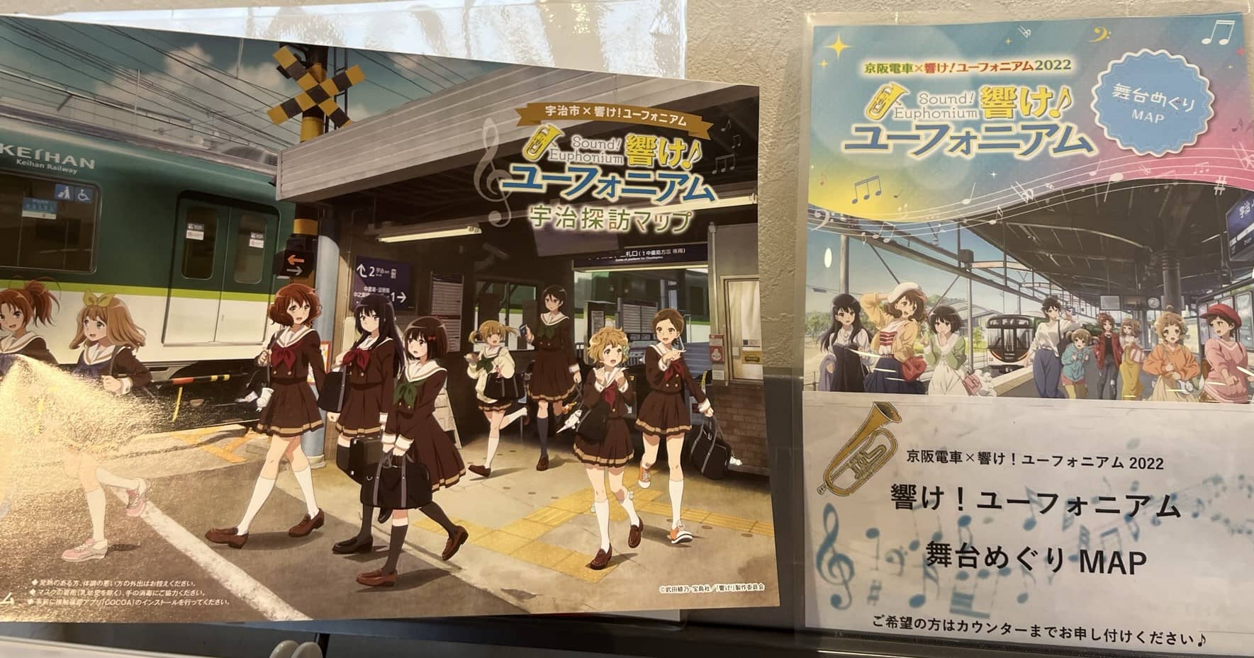 观光中心里有京吹联动立牌和粉丝留言册。似乎有个粉丝经常会来这里为每一位过生日的角色画画。我也在留言册上用中文写下了对工作人员的感谢。更为神奇的是这里的桌子是菟道高中搬过来的,看来菟道高对京吹也是爱意满满。